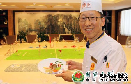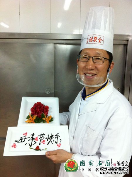 全聚德和平门店的冷荤厨师长王国民。自从1979年参加工作,就一直从事餐饮业,从颐和园听鹂馆到全聚德,得到了很多大师的指点。在听鹂馆,他曾师从黄恩顺、赵德明等师傅,开始接触清宫满汉全席制作技艺,领略皇家御膳的深厚底蕴和博大精深。在全聚德,先后从事热菜、烤鸭、面点、冷荤等工种的工作,师从蔡启厚、王春隆、陈守斌、杨学智、王荣等一批国宝级烹饪大师,他们的言传身教令王国民受益匪浅,目前王国民获得了中餐高级烹饪技师、国家名厨、中国烹饪大师、中国药膳大师等荣誉称号。