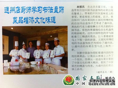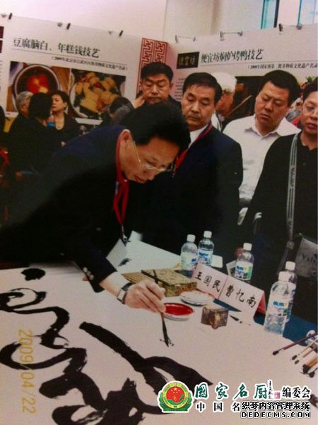在当今激烈的市场竞争中,百年老店全聚德在传承和创新的同时,也面对着如何更好地提高菜品的文化附加值这个问题。面对这个问题,王国民一直在思索能否将自己的业余爱好书法与专业工作结合起来?他初步设想将中国书画的传统艺术引入到冷荤盘饰中来,开始推出“盘饰书法”——即将甜面酱等原料放在“挤壶”中,在盘子上边挤边写书法。